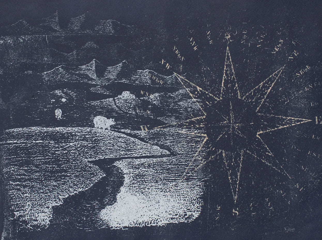 Bear Road, (2016), Monotype, 10 in. x 13 in., was created as a collaboration with the poet Mg Roberts. Read about the collaboration at Art Practical.