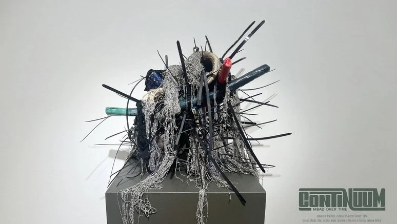 Image: Ramekon O’ Arwisters, Bitten #8 (2022), ceramic shards, zip ties, fiber, beads.